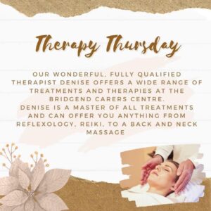 Therapy Thursday Our wonderful fully qualified therapist Denise offers a wide range of treatments and therapies at the carers centre. Denise is a master of all treatments and can offer you